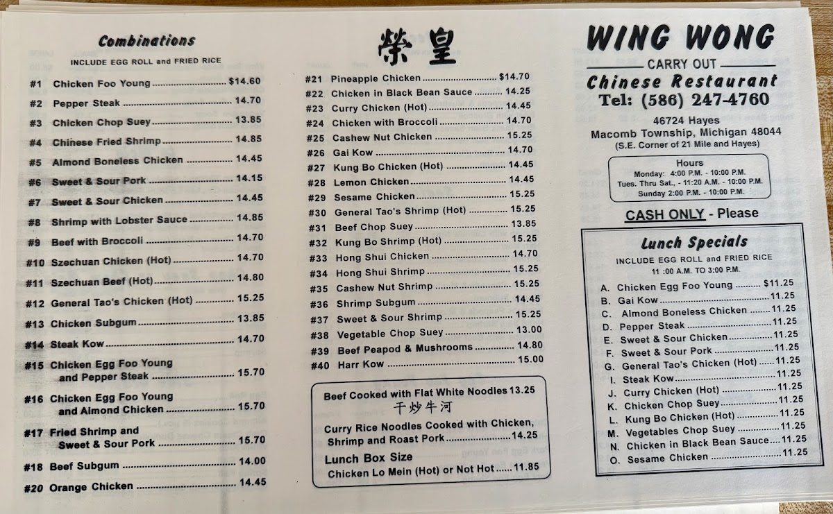 At Wing Wong Carryout Restaurant, the menu feels focused and comforting, leaning into familiar Chinese-American favorites that deliver consistency and value rather than overcomplication. Dishes like Sesame Chicken and Sweet and Sour Chicken stand out for their balance of crisp texture and crowd-pleasing sauces, making them reliable choices for repeat visits. Almond Boneless Chicken reflects the restaurant’s classic Midwestern Chinese style, pairing a hearty portion with a mild, savory profile that’s filling without being heavy. For diners who prefer beef, Pepper Steak brings a straightforward combination of tender meat and vegetables, offering a satisfying contrast to the sweeter chicken options. The chicken selection continues to show range with Orange Chicken, which leans bright and citrusy, and Szechuan Chicken Hot, clearly aimed at those who enjoy a bolder, spicier kick. On the appetizer side, Crab Rangoon adds a familiar creamy crunch that complements the main dishes well, while a simple Dinner Roll rounds out the meal with an unpretentious, home-style touch. Taken together, the menu highlights a clear commitment to recognizable flavors and generous portions, making it easy to understand why these specific items remain the restaurant’s most talked-about choices.
